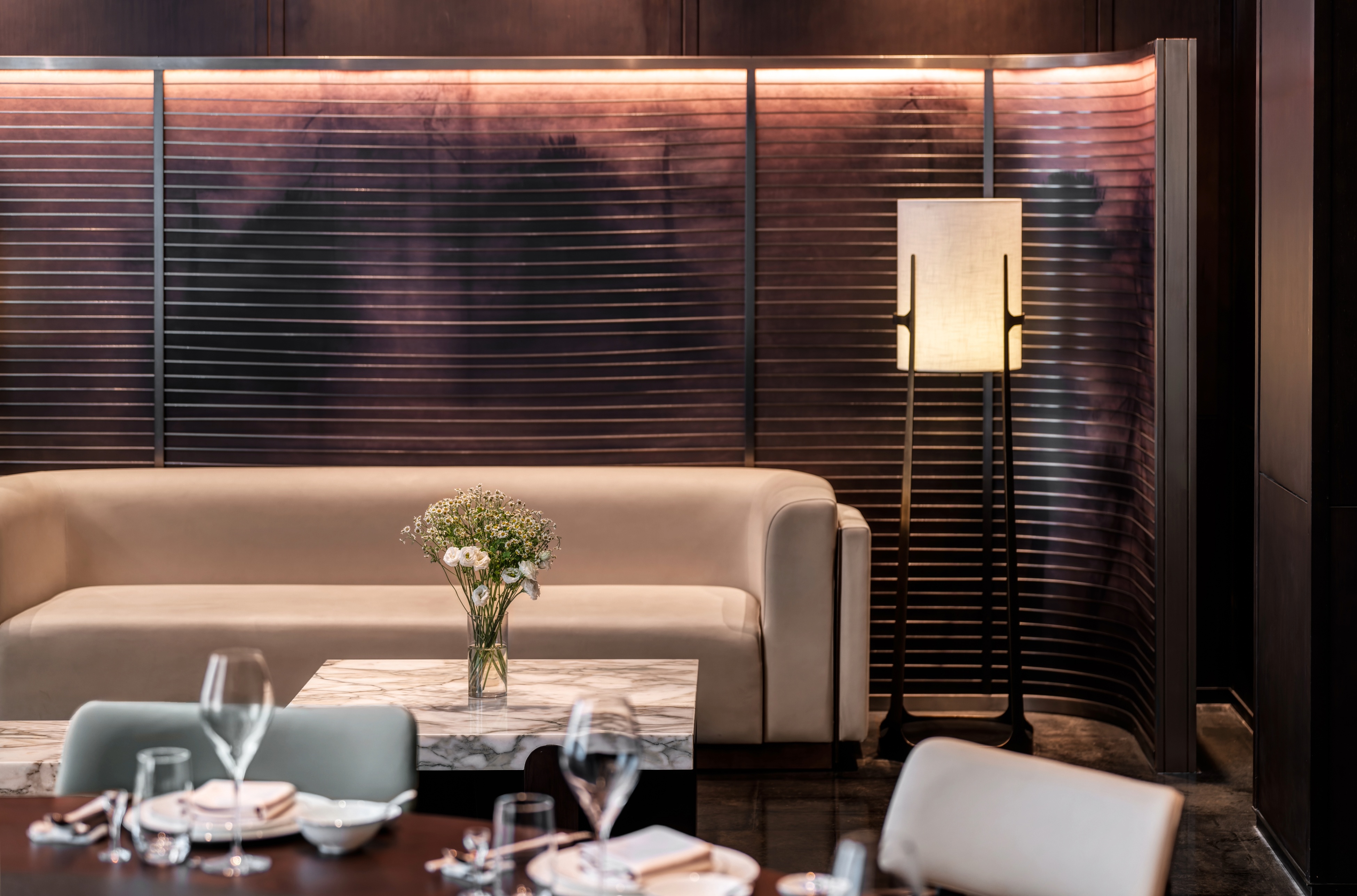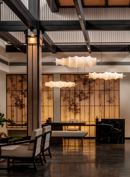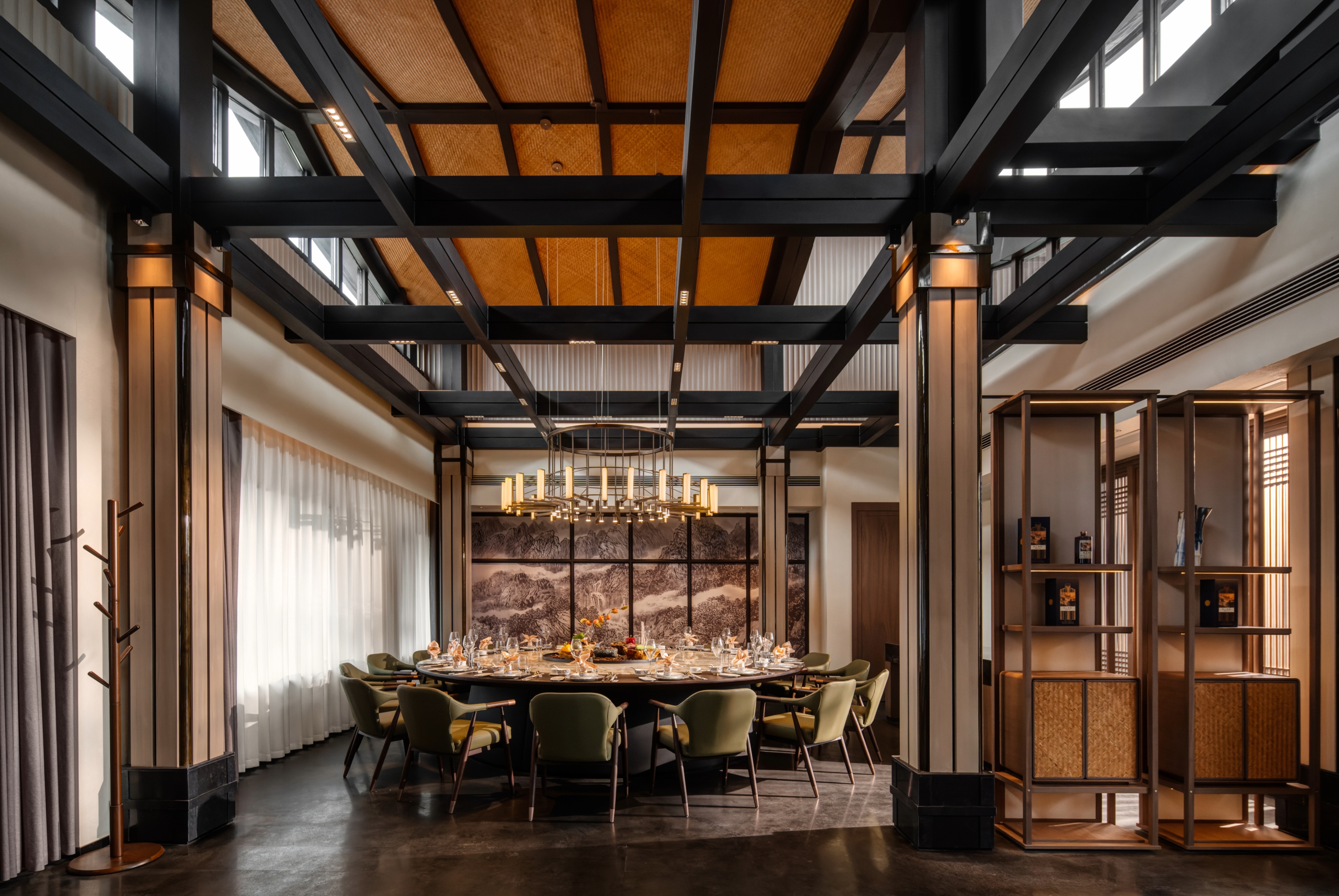 In the main banquet hall, bamboo-node patterned partition establishes a warm foundation, while lighting fixtures shaped like sprouting bamboo shoots symbolize renewal. The reimagined space accommodates both grand events and intimate gatherings, with careful attention to sightlines that enhance every occasion.