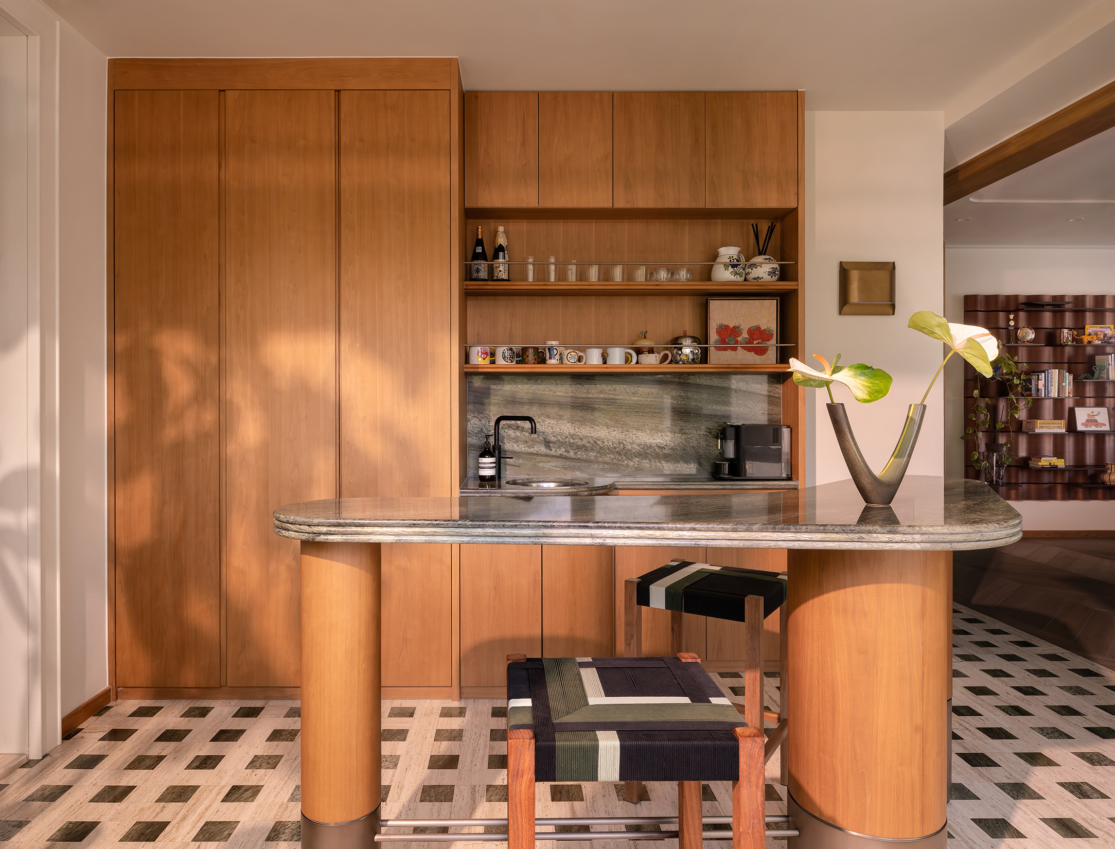公共軸線被精準劃分為三個交織的生活場景:面向景致的低矮弧形沙發區,承載親子說書與日落靜觀;貼牆而設的絲絨軟座配合滿幅餐桌與幾張木製扶手椅,在不佔走道的前提下容納闔家宴聚;通往廚房的露台一隅設置回旋形小型吧檯——清晨咖啡、黃昏小酌、節慶備餐的前置區——在同一空間悄然拓寬社交維度。